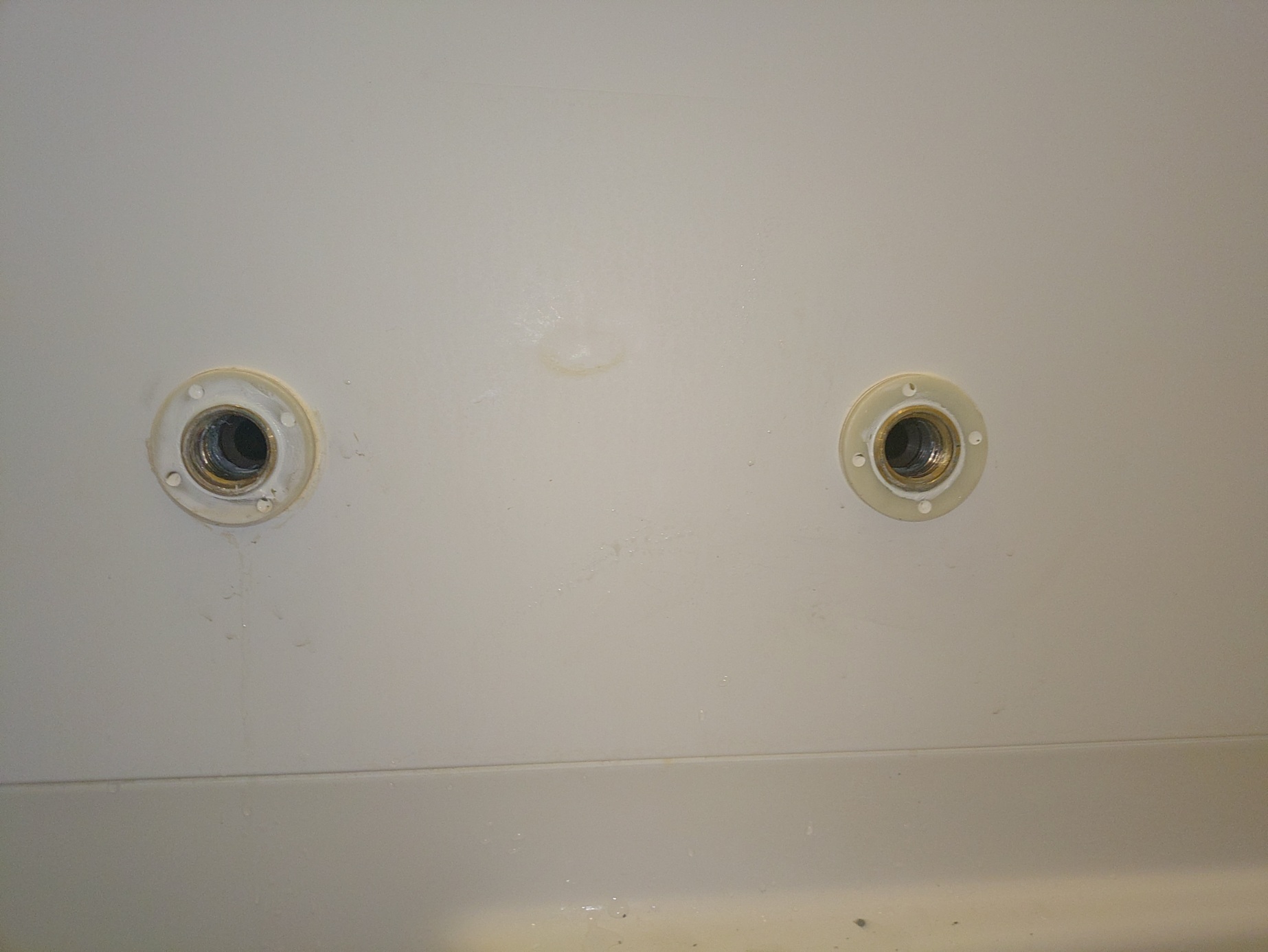既存のシャワーを外した状態。 お湯と水の配管の穴の位置が20cm間隔の場合は どこのメーカーのシャワーでも取り付けができます。 |