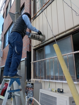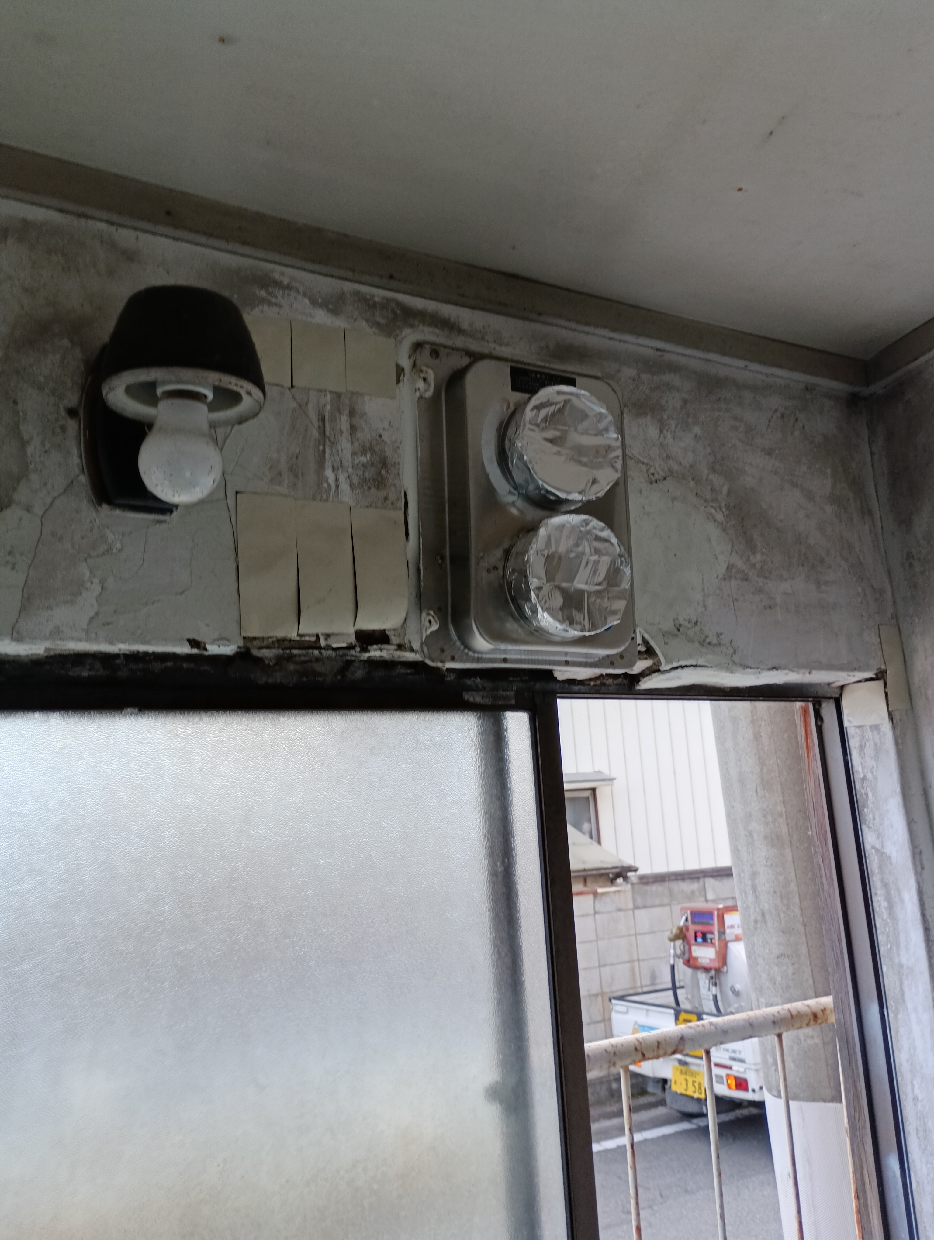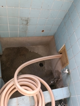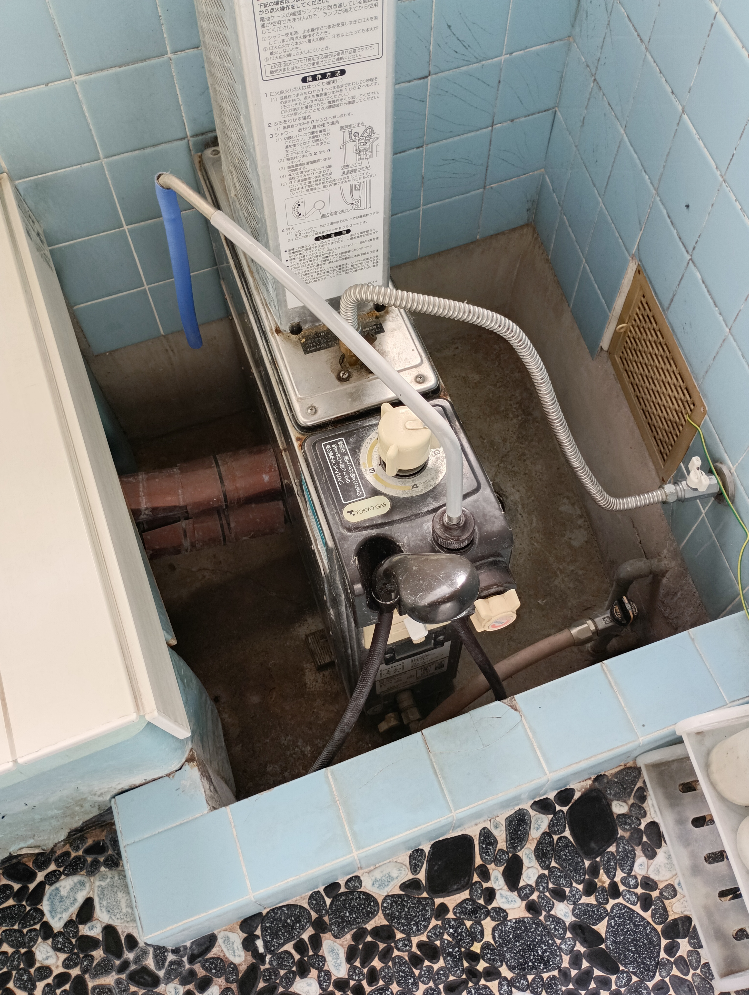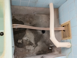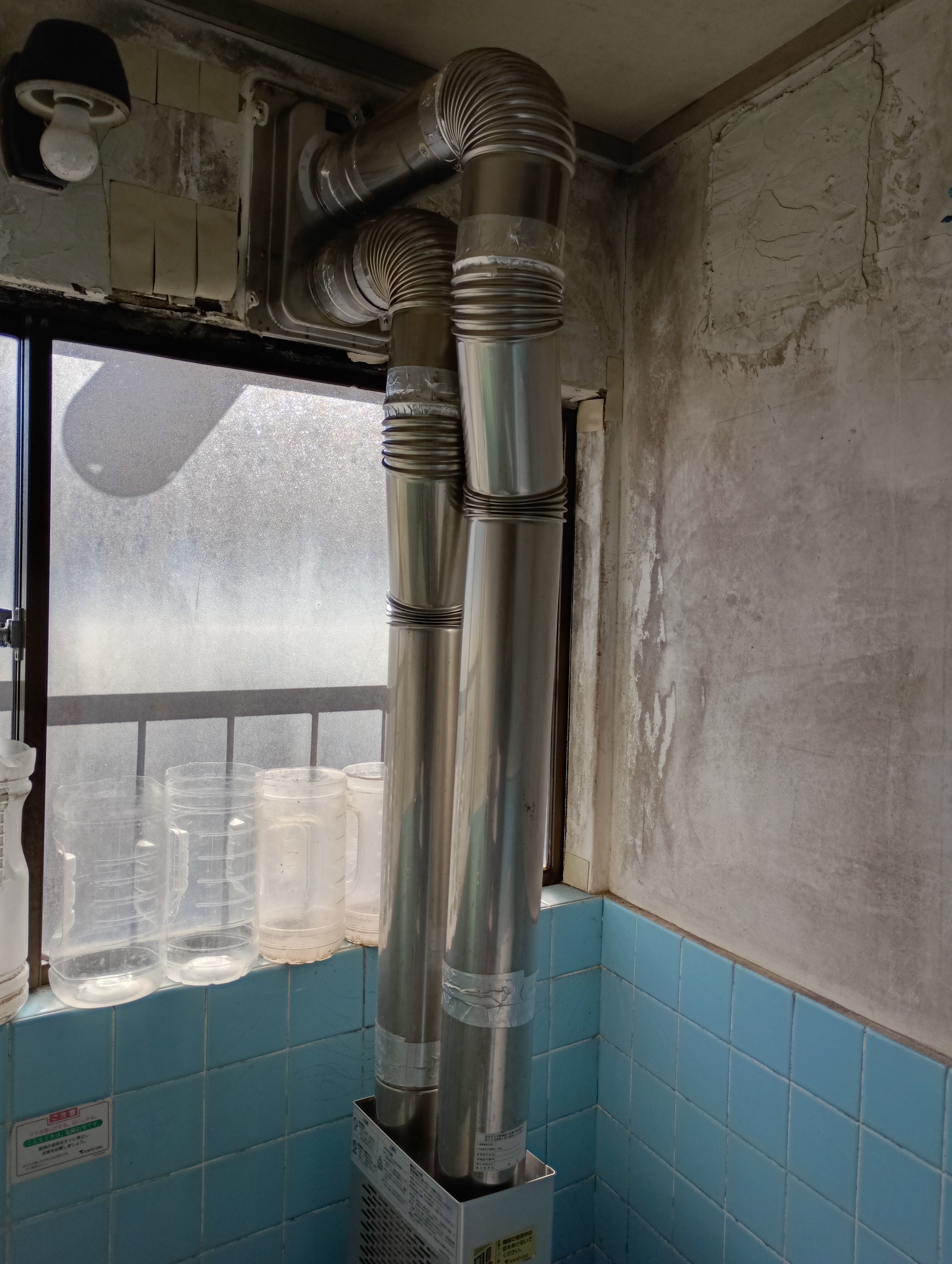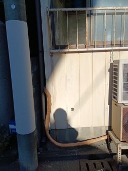 | 交換前の風呂釜 | 風呂釜の排気筒の写真 | 給湯器設置前の壁 | 追い炊き配管を通気口から出します。 | |
