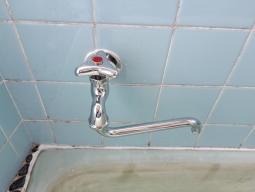 | 排気筒を切断している写真 | 追い炊き配管、水の配管接続済の写真 | 新しく取付したお湯の蛇口です。 | 浴室リモコンの写真です。 | |