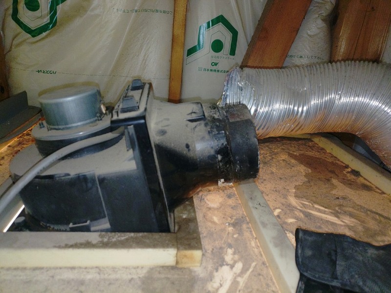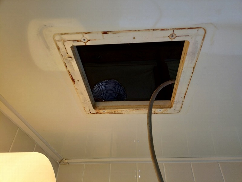 お客様がお使いの浴室換気扇はスイッチを入れるとものすごく大きい音がしました。 浴室の換気扇を交換する工事は脚立を使い浴室の天井の点検口のふたを開けて作業をします。 |