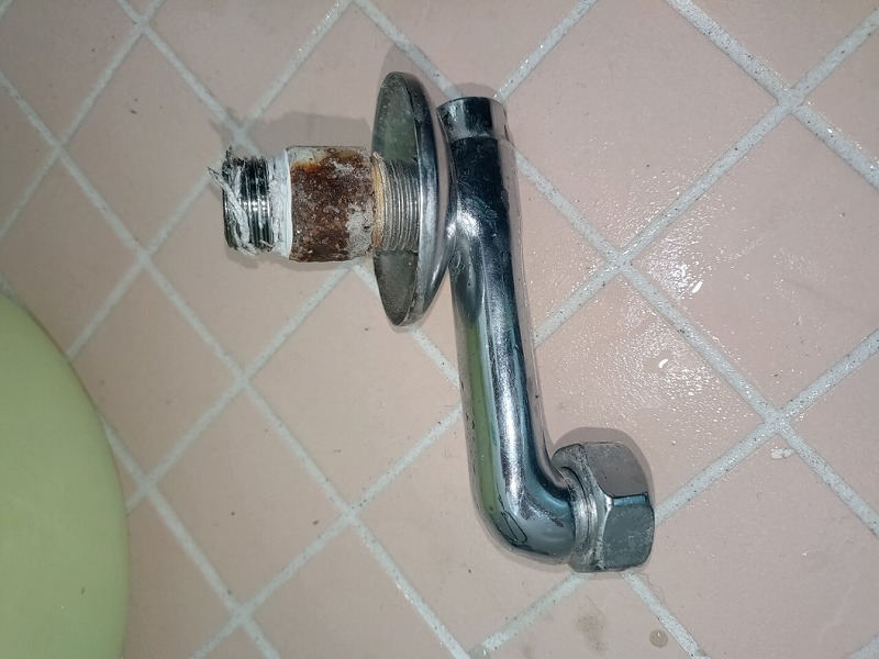既存のシャワーを外すと付け根の配管が一緒に取れてきました。 通常「持ち出し」と呼ばれる配管部品ですがサビているので交換します。 |