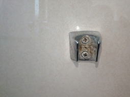 新しい配管部品を壁の中に取り付けました。 | シャワーフックも錆びていました。 | シャワーフックも新しいものに交換しました。 | お客様が年配の方で今までと同じ使い方のものとご希望されましたので同じ2ハンドルのシャワーに交換させて頂きました。 |