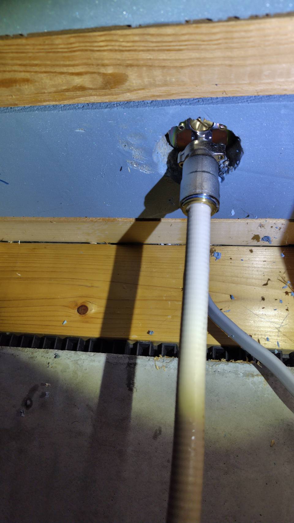 | 穴を開けます | ファンヒーター用にコックを設置しました。 | ガス管を床下で分岐します。 | 床下からの様子 |