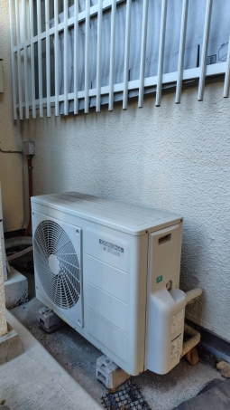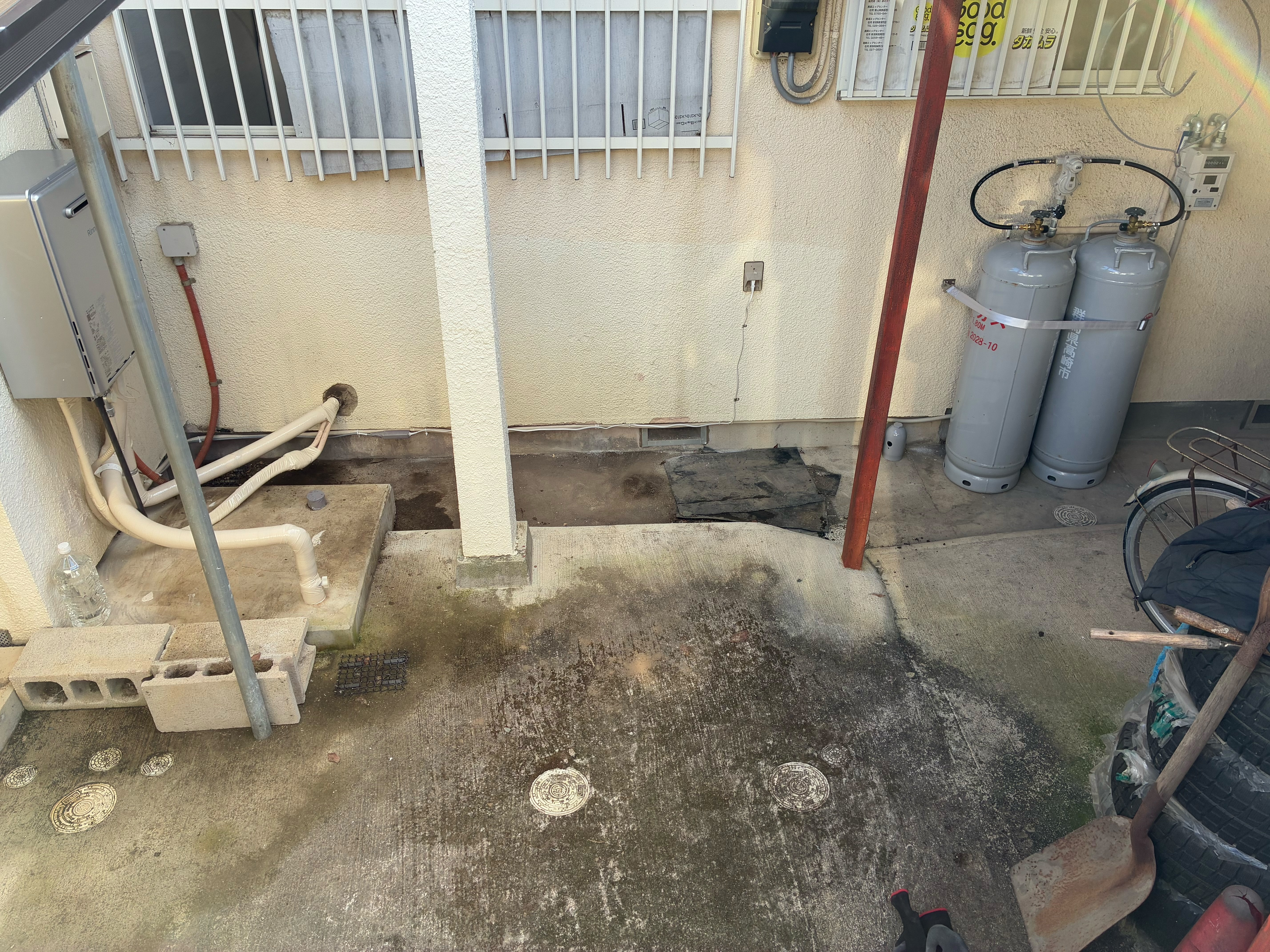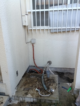 | 撤去前のエコキュート | 撤去前のエコキュートの室外機 | 撤去後の壁面 | ガス設備を新設します。 | 作業途中の様子 |