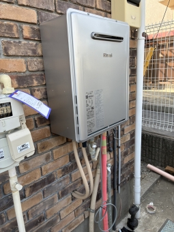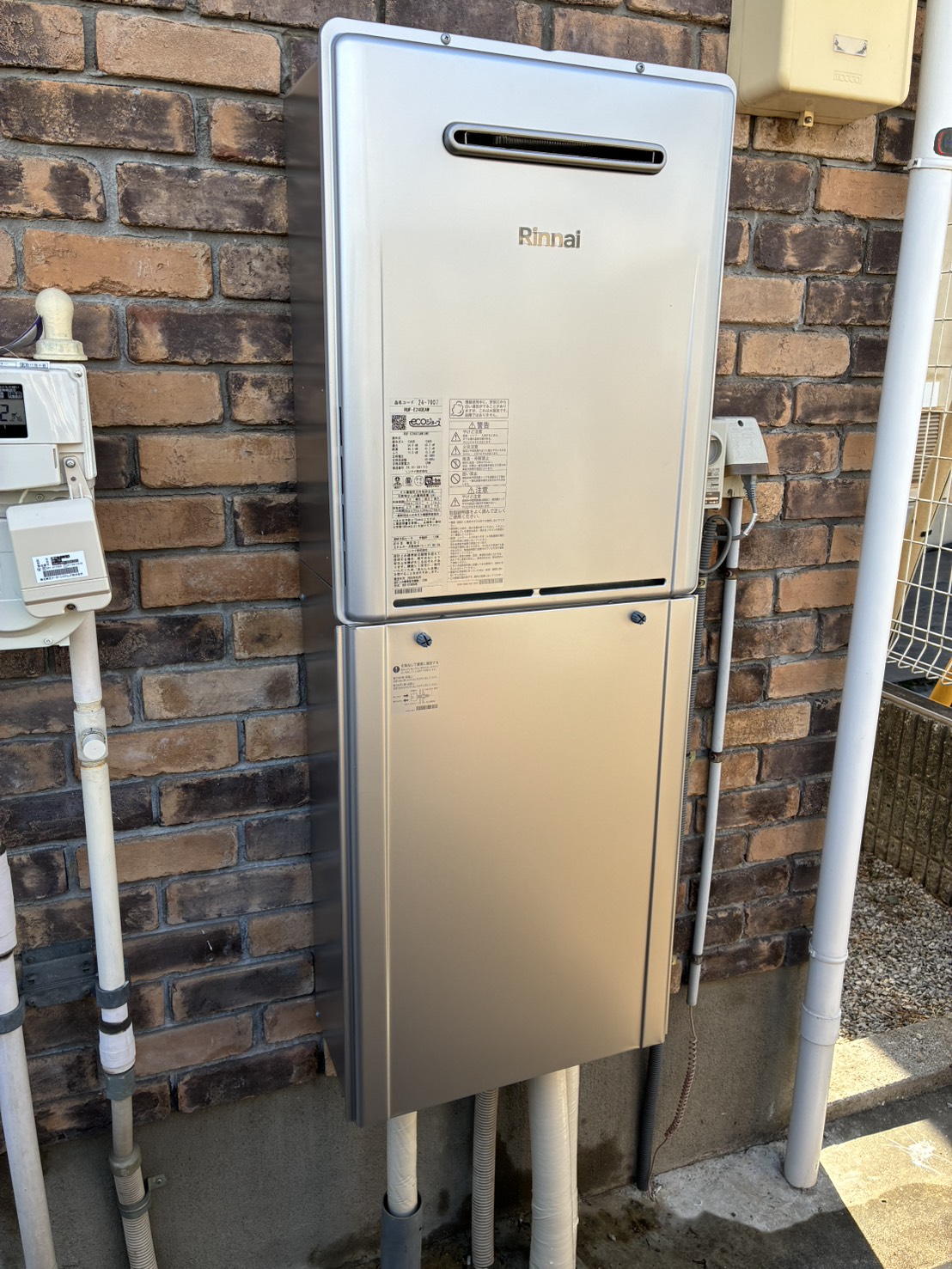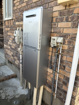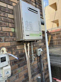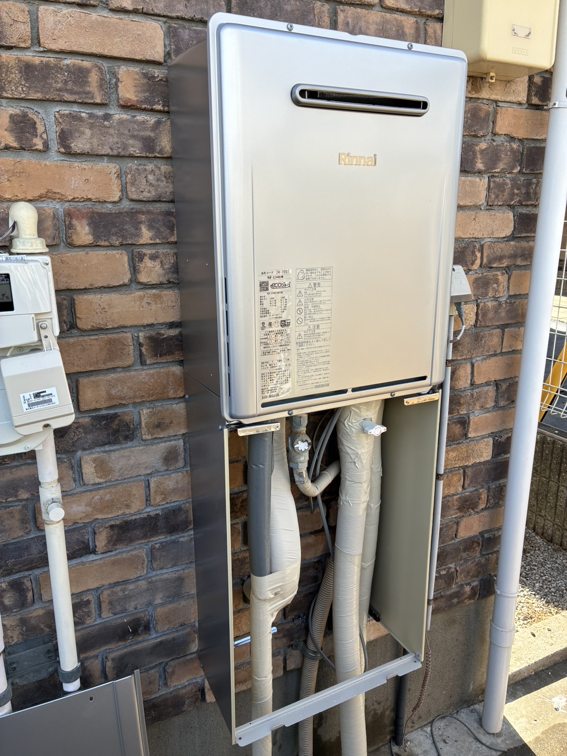 今までの給湯器は、配管カバーが無かったのですが、今回はしっかり保温した上に、配管カバーを設置させて頂きました。